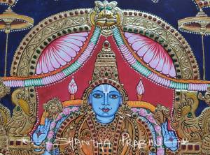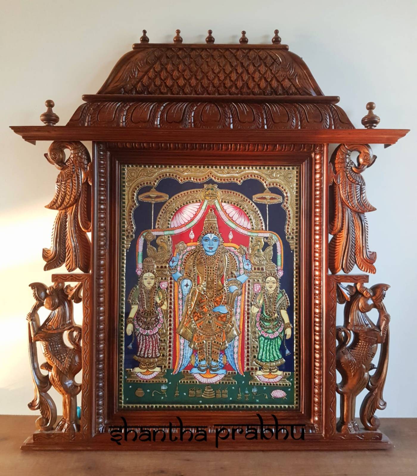 The painting is a Thanjavur Painting of Lord Veera Venkatesh accompanied by His consorts ShreeDevi and BhooDevi.