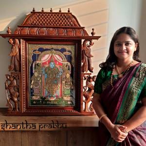 The painting was customized on order for Mrs. Archana Prabhu and Mr. Avinash Prabhu’s beautiful house. It has been made on a handmade Tanjore canvas, and is gemset and gilded with authentic 22ct gold leaf. The painting has been mounted in a pure teak wooden frame.