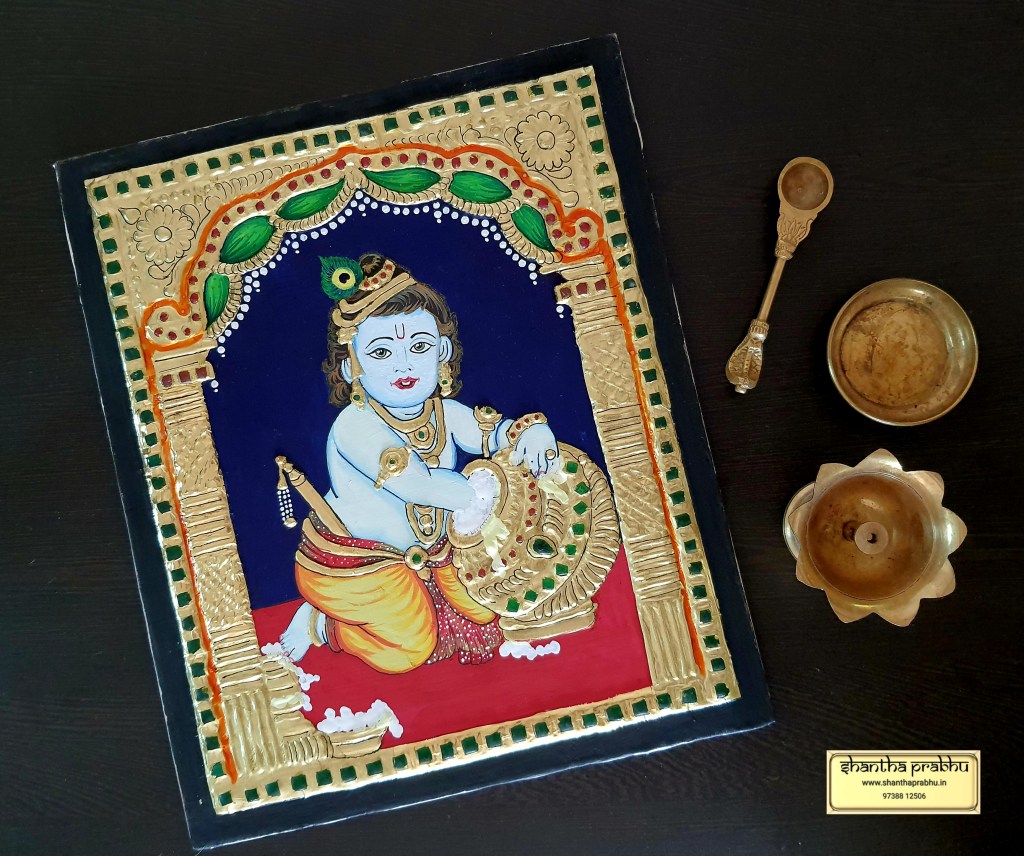 This is a 2D Thanjavur Painting of little Butter Krishna.