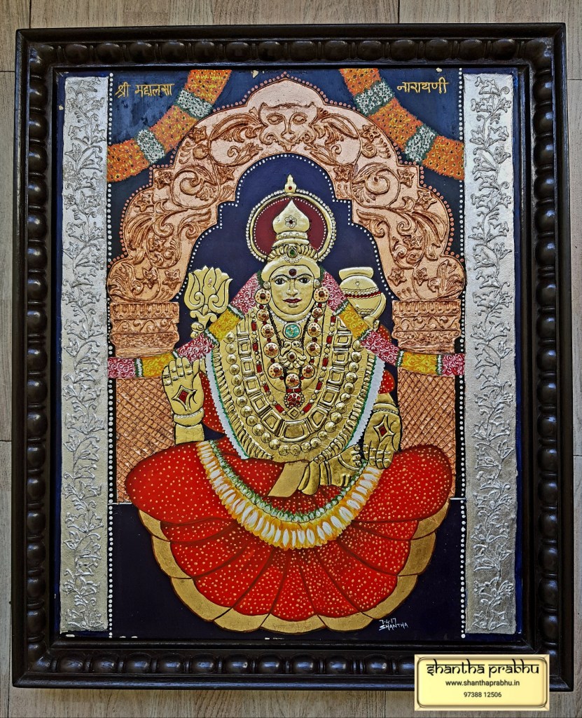 The painting is a framed Thanjavur Painting of Media Tanjore painting of Devi Mahalasa Narayani, Konchady.