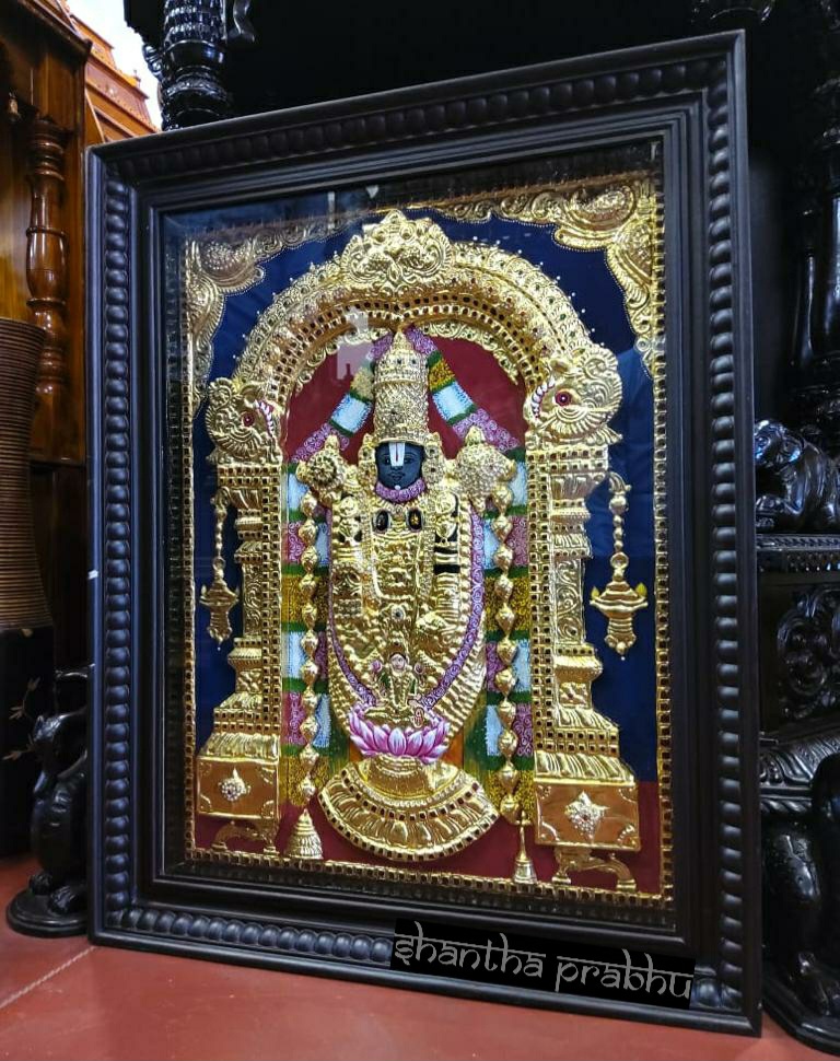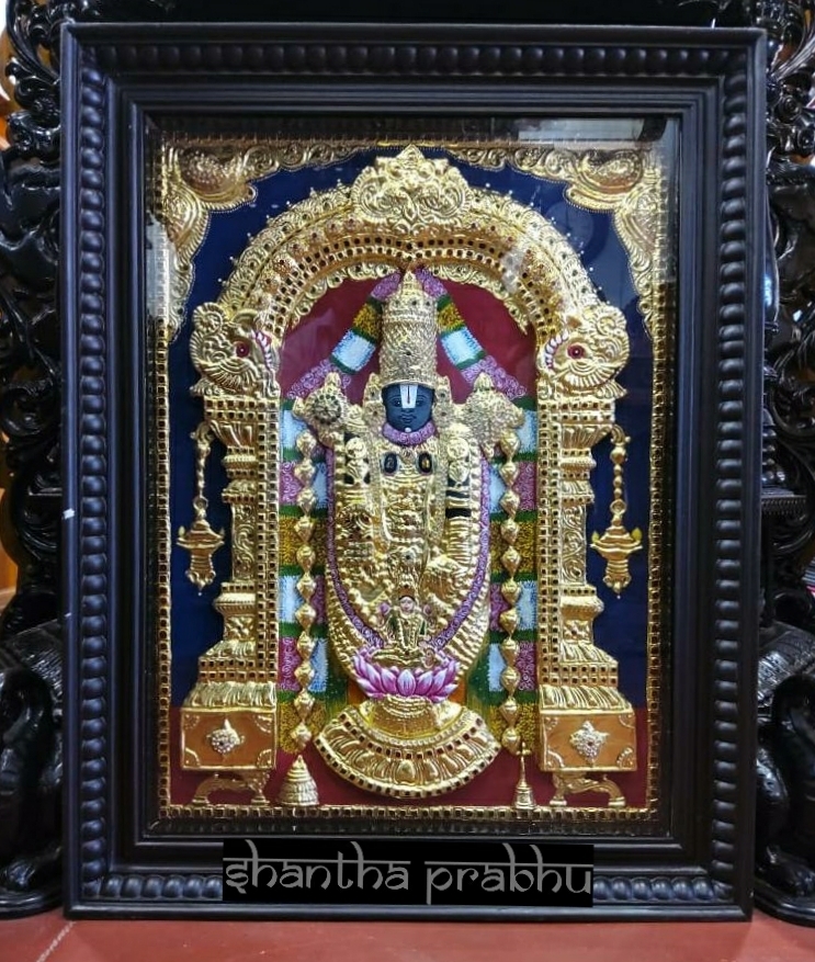 This is a 3D Super Embossed Thanjavur Painting of Lord Balaji with consort Devi Lakshmi