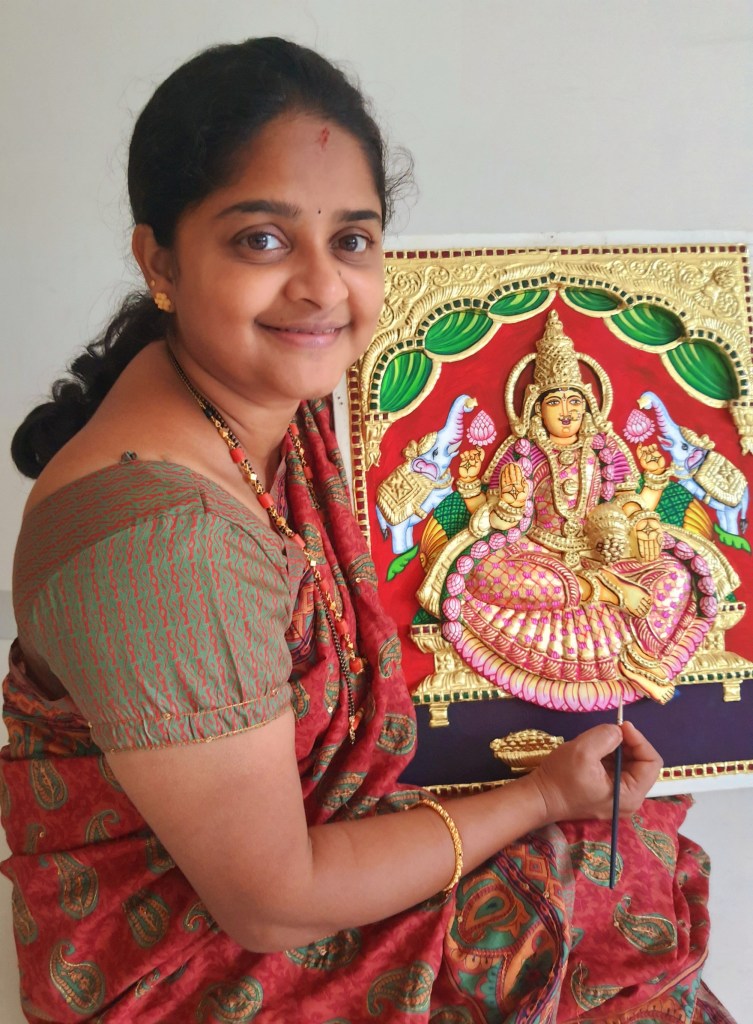 The painting has been made on a handmade Tanjore Board, gemset with semi precious jaipore stones and gilded with authentic 22ct gold leaf. The painting has an option of a pure chettinad teak wood frame. The painting comes with a signed authenticity certificate.