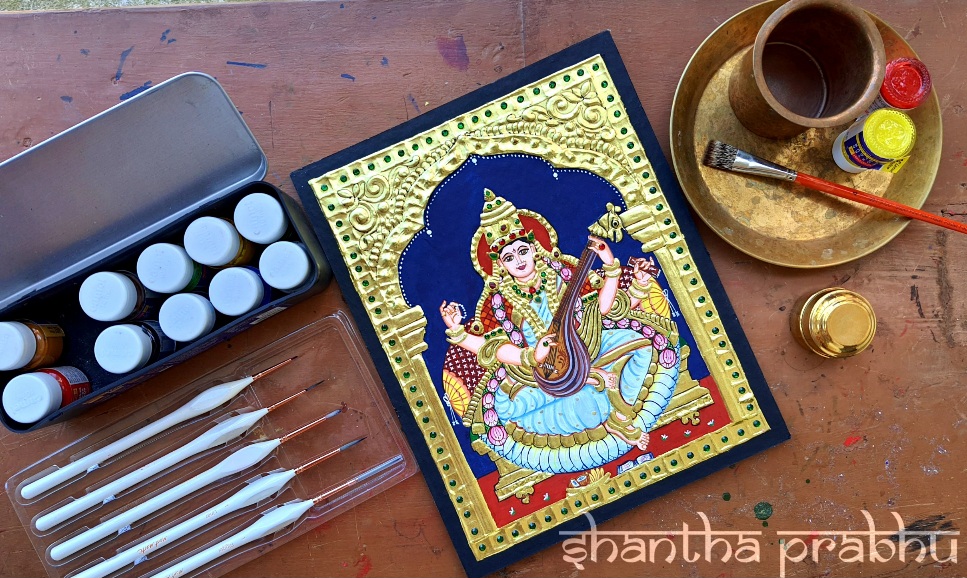 The painting has been made on a handmade Tanjore Board, gemset with semi precious jaipore stones and gilded with authentic 22ct gold leaf. The painting has an option of a pure chettinad teak wood frame. The painting comes with a signed authenticity certificate.