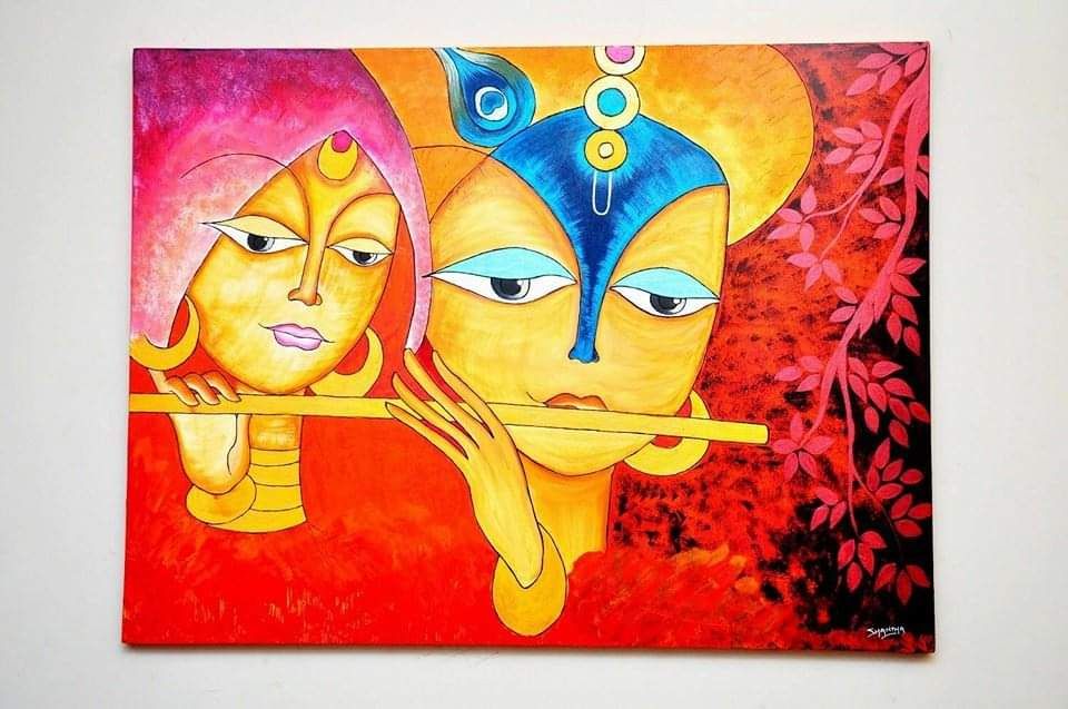 This painting is a 3 × 4ft acrylic on canvas abstract painting of Radha and Krishna which has been painted with a fiery colour palette. There are soft acrylic paints, acrylic paints, tube paints for knife work, pearl paints, metallic paints, 3d cone liners and glass paints in this one.