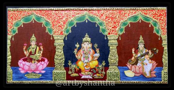 TITLE: Lakshmi Ganpathi Saraswathi A 2D Tanjore Painting SIZE: 18 X 36 inches
