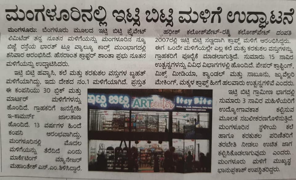 Udayavani, A Kannada News daily mentions details about Itsy Bitsy’s first store in Mangalore and Inauguration details where I was invited as the chief guest for the Ribbon Cutting ceremony.